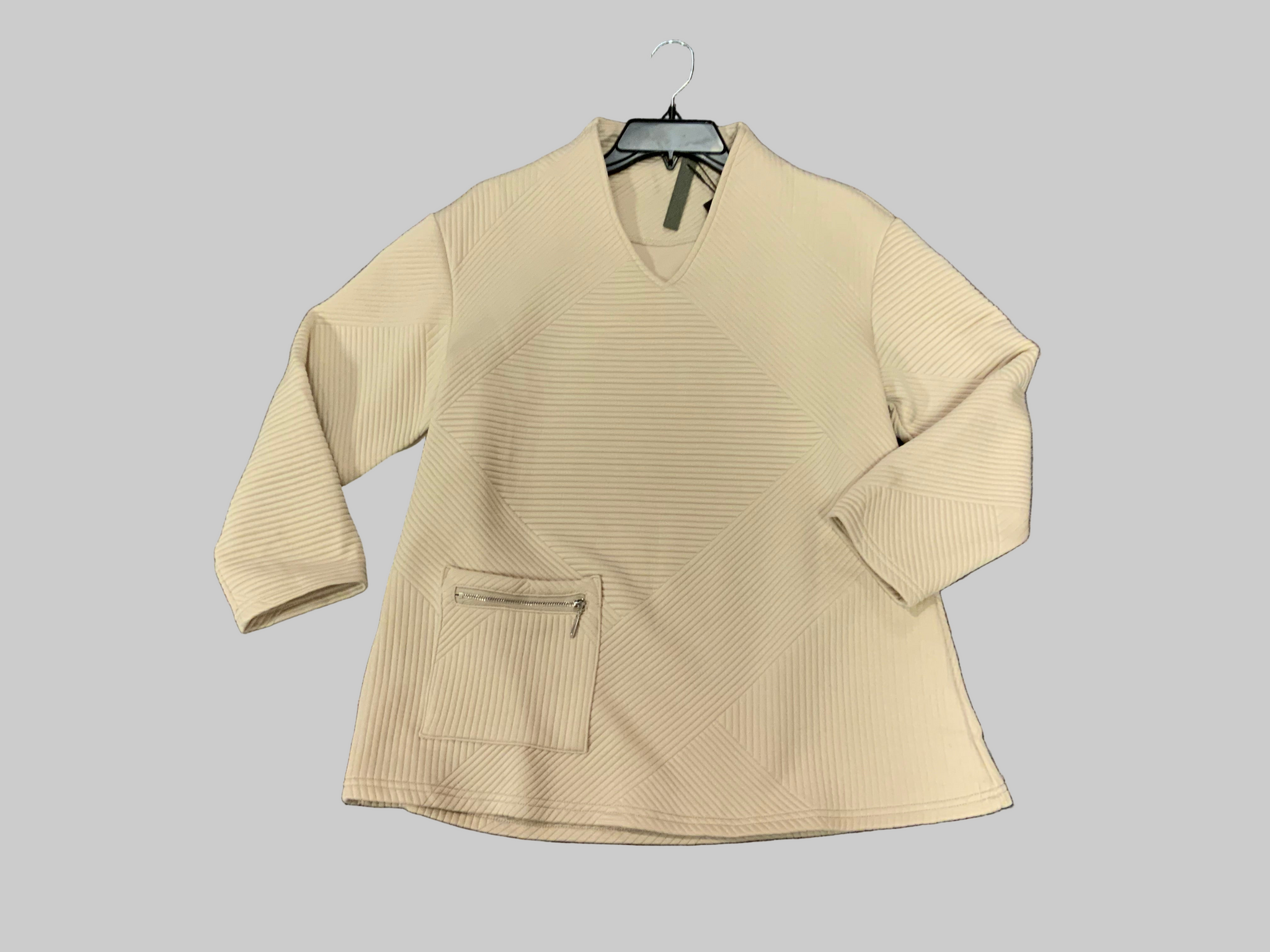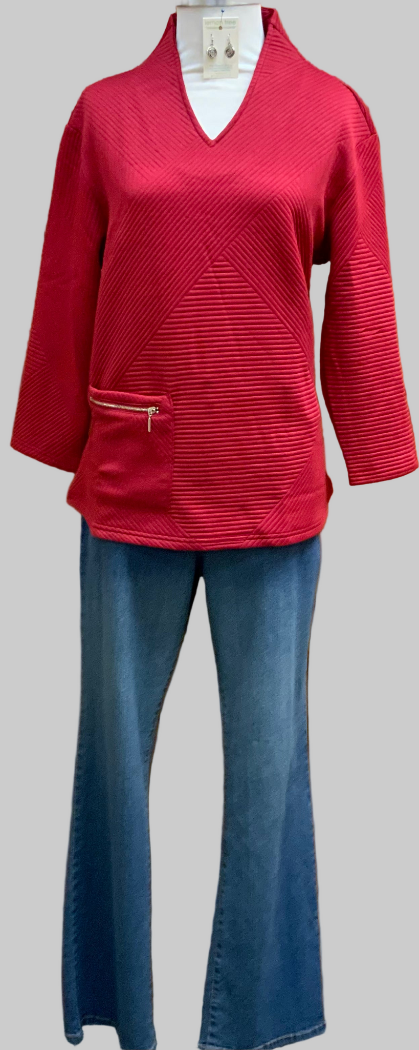 The Aimee top features a great neckline, fun texture, and a convenient pocket. Its 3/4 sleeve design is perfect with jeans or dress slacks.  With its stylish and functional features, this top is a must-have for any wardrobe. It offers a perfect balance of comfort and style, making it a versatile addition to your closet.
